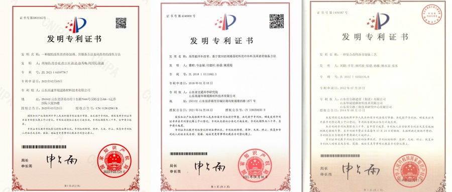 公司研制的MAC改性瀝青獲得了《一種凝膠改性瀝青添加劑、其制備方法及對瀝青的改性方法》和《高性能冷補瀝青、基于廢舊瀝青路面材料的冷補料及兩者的制備方法》等發(fā)明專利授權(quán)。MAC改性瀝青大碎石柔性基層新型路面結(jié)構(gòu)獲得實用新型專利證書。