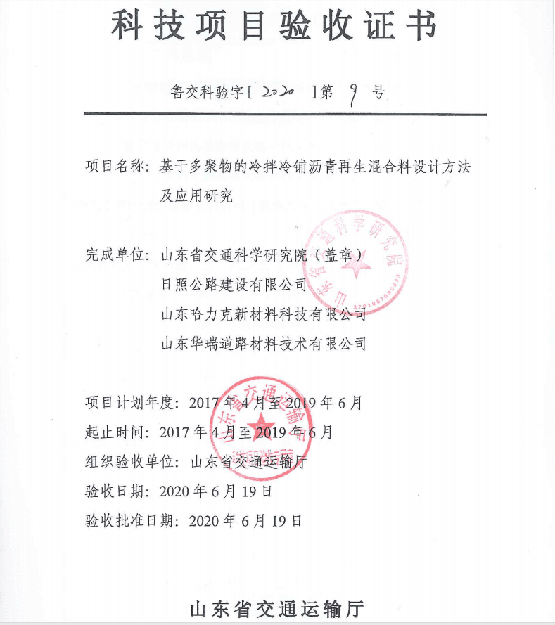 6月19日,我公司參加的“基于多聚物的冷拌冷鋪瀝青再生混合料設(shè)計方法及應(yīng)用研究”課題,順利通過了山東省交通運輸廳組織的成果驗收和評價工作。