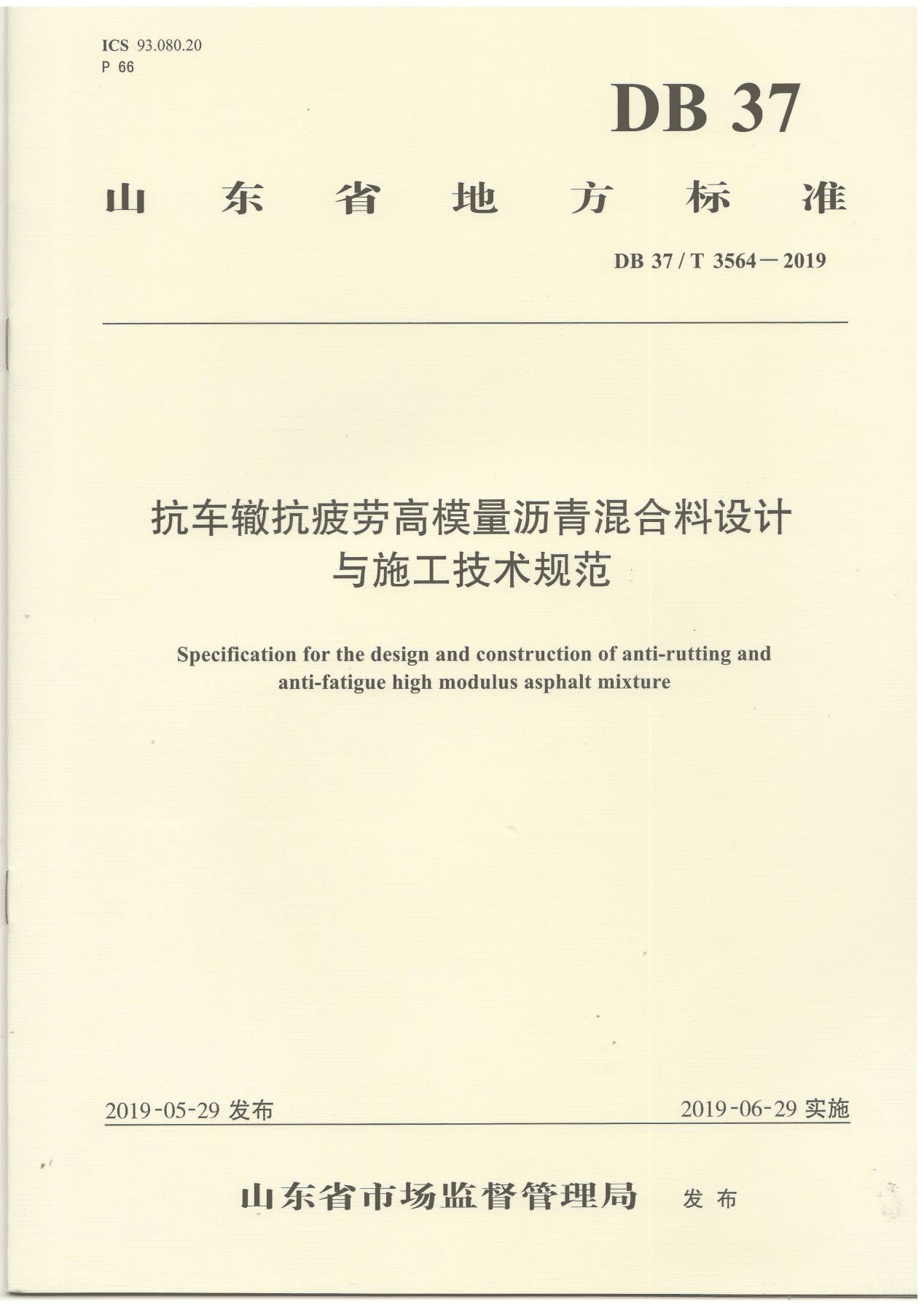近日,公司參與編制的山東省地方標(biāo)準(zhǔn)《抗車(chē)轍抗疲勞高模量瀝青混合料設(shè)計(jì)與施工技術(shù)規(guī)范》(DB 37/T 3564-2019)正式出版印刷。