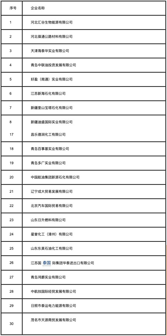 根據(jù)商務部2012年第66號公告《公布2013年燃料油非國營貿(mào)易進口允許量申領(lǐng)程序、分配原則》(以下簡稱《公告》)的要求,中國五礦化工進出口商會對新申請2013年第二批燃料油非國營貿(mào)易進口企業(yè)報送的材料進行審核,商務部外貿(mào)司對審核情況進行了復審。截止2013年3月31日,共有41家企業(yè)報送了申請材料,其中符合《公告》要求的有30家企業(yè),現(xiàn)將材料齊全企業(yè)名單進行公示,公示期為2013年4月19-25日。公示期間,對公示名單有異議的,可向商務部(外貿(mào)司)提請公示復核。同時公布材料不齊全企業(yè)名單及所缺材料,公示期間,各相關(guān)企業(yè)仍可將補充材料報送至商務部外貿(mào)司,同時抄送中國五礦化工進出口商會。