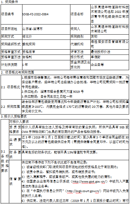 山東高速華瑞道路材料技術有限公司選取2022年度瀝青專用包裝袋供應商項目詢比采購公告