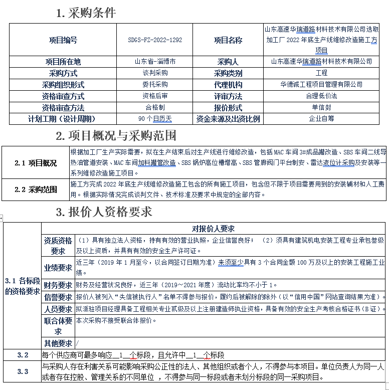 山東高速華瑞道路材料技術有限公司選取加工廠2022年底生產(chǎn)線維修改造施工方項目談判采購公告