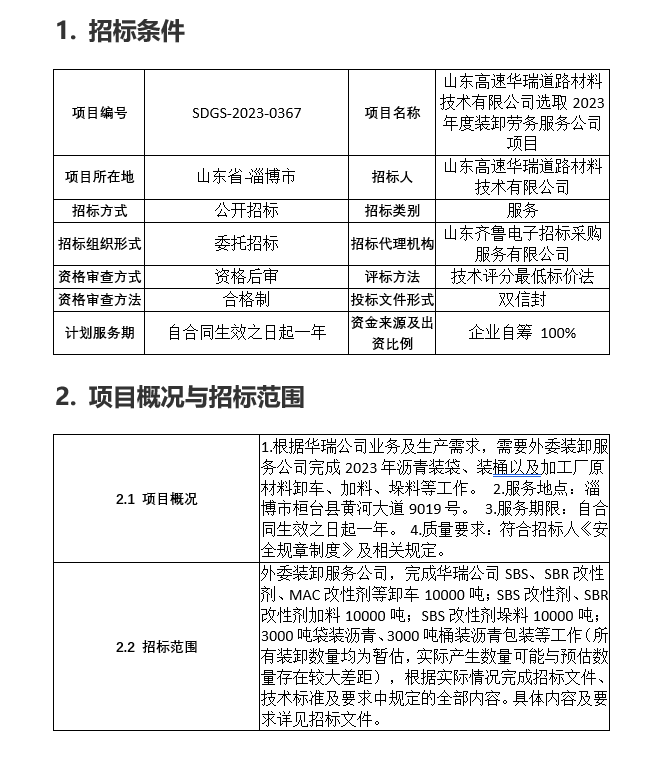 山東高速華瑞道路材料技術(shù)有限公司選取2023年度裝卸勞務(wù)服務(wù)公司項(xiàng)目招標(biāo)公告
