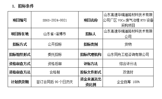 山東高速華瑞道路材料技術(shù)有限公司 廠區(qū)VOCs廢氣治理RTO設(shè)備采購(gòu)項(xiàng)目招標(biāo)公告