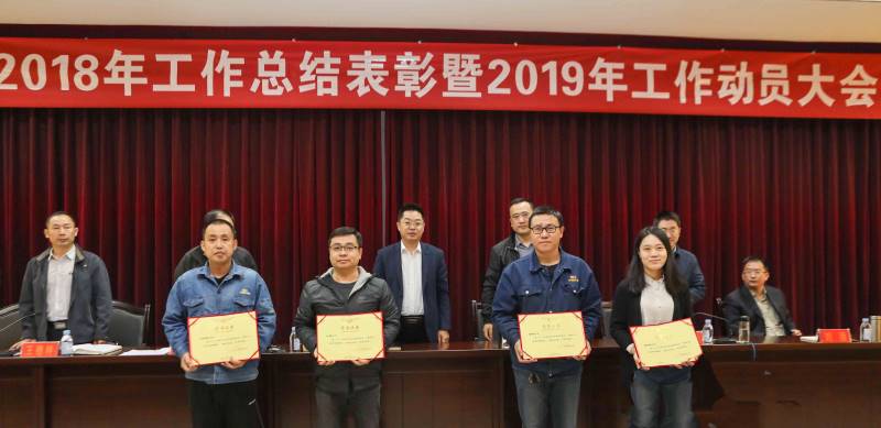 會上,對2018年度先進進行表彰,公司高管為獲獎?wù)哳C獎,并與他們合影留念。