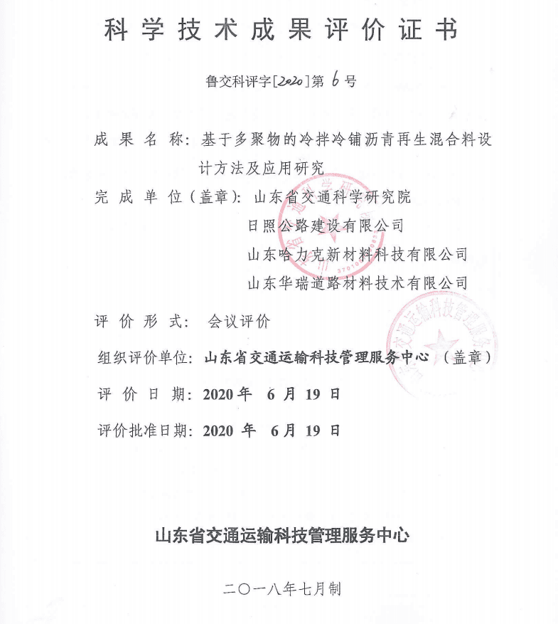 6月19日,我公司參加的“基于多聚物的冷拌冷鋪瀝青再生混合料設(shè)計方法及應(yīng)用研究”課題,順利通過了山東省交通運輸廳組織的成果驗收和評價工作。