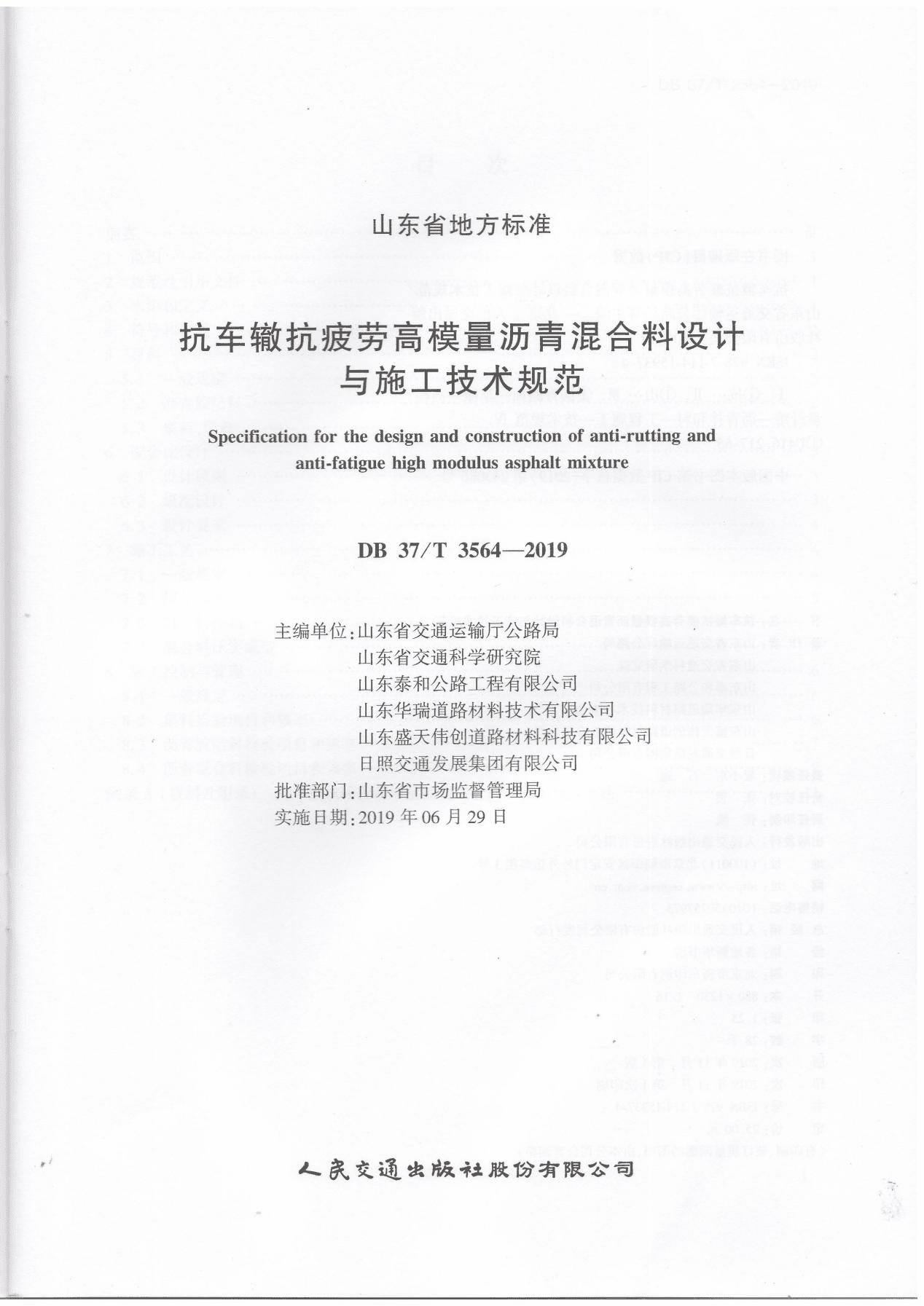近日,公司參與編制的山東省地方標(biāo)準(zhǔn)《抗車(chē)轍抗疲勞高模量瀝青混合料設(shè)計(jì)與施工技術(shù)規(guī)范》(DB 37/T 3564-2019)正式出版印刷。