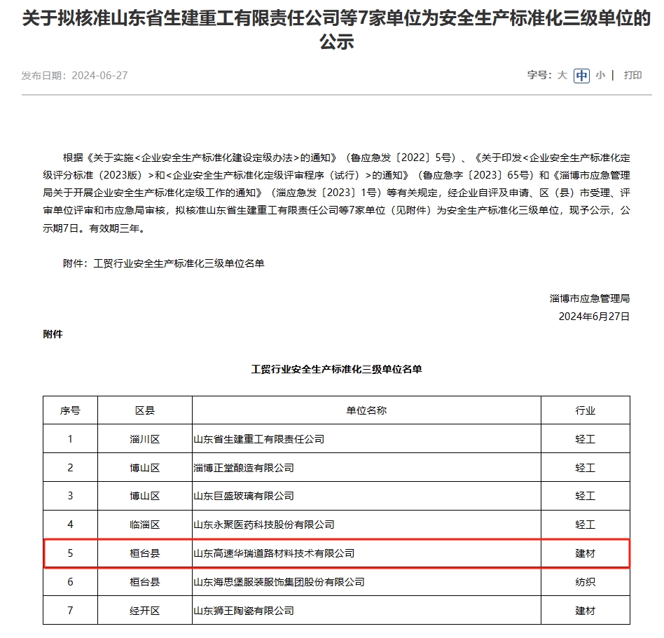 近日,淄博市應(yīng)急管理局發(fā)布公告,華瑞公司順利獲評淄博市工貿(mào)行業(yè)安全生產(chǎn)標(biāo)準(zhǔn)化三級單位。