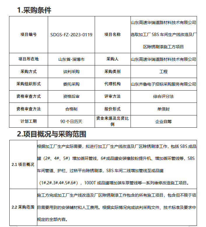 山東高速華瑞道路材料技術(shù)有限公司選取加工廠SBS車間生產(chǎn)線改造及廠區(qū)除銹刷漆施工方項(xiàng)目談判采購公告